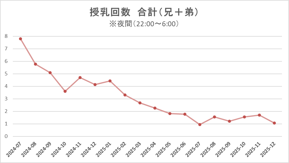 合計8回程度から始まり、1歳(2025/6)には、合計で2回程度になりました。夜間ミルクの卒業はかなり遅い方かもしれません。