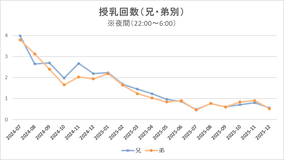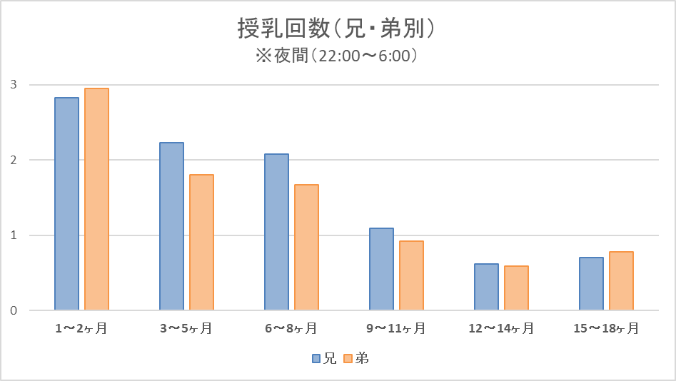 兄の方が授乳回数が多かった印象です。データとしても少し多いですね。