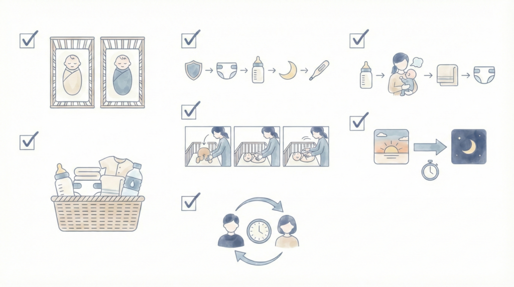 だからこそ、泣いたら①安全 → ②オムツ → ③空腹 → ④眠い → ⑤環境の順で“作業”にしました。